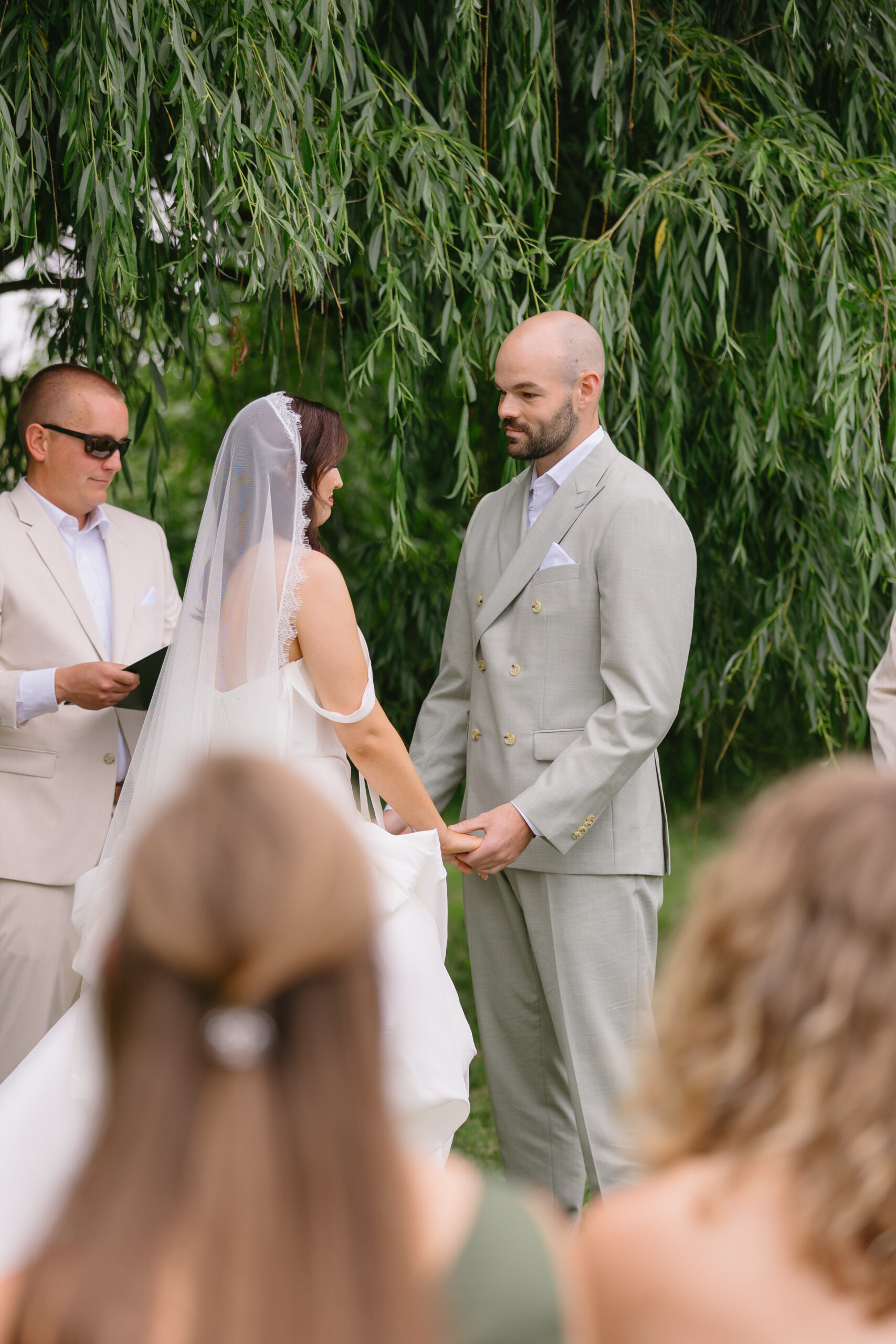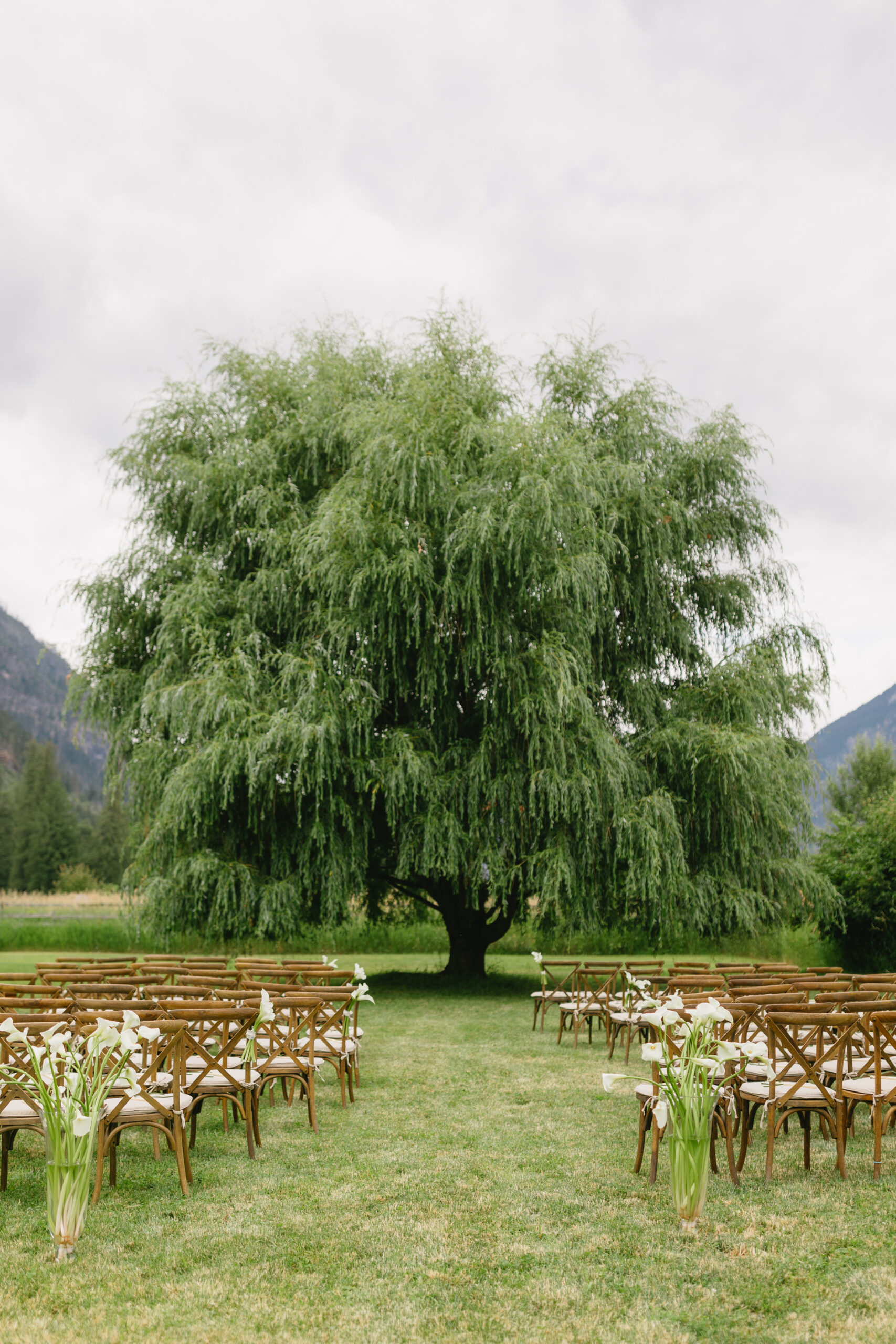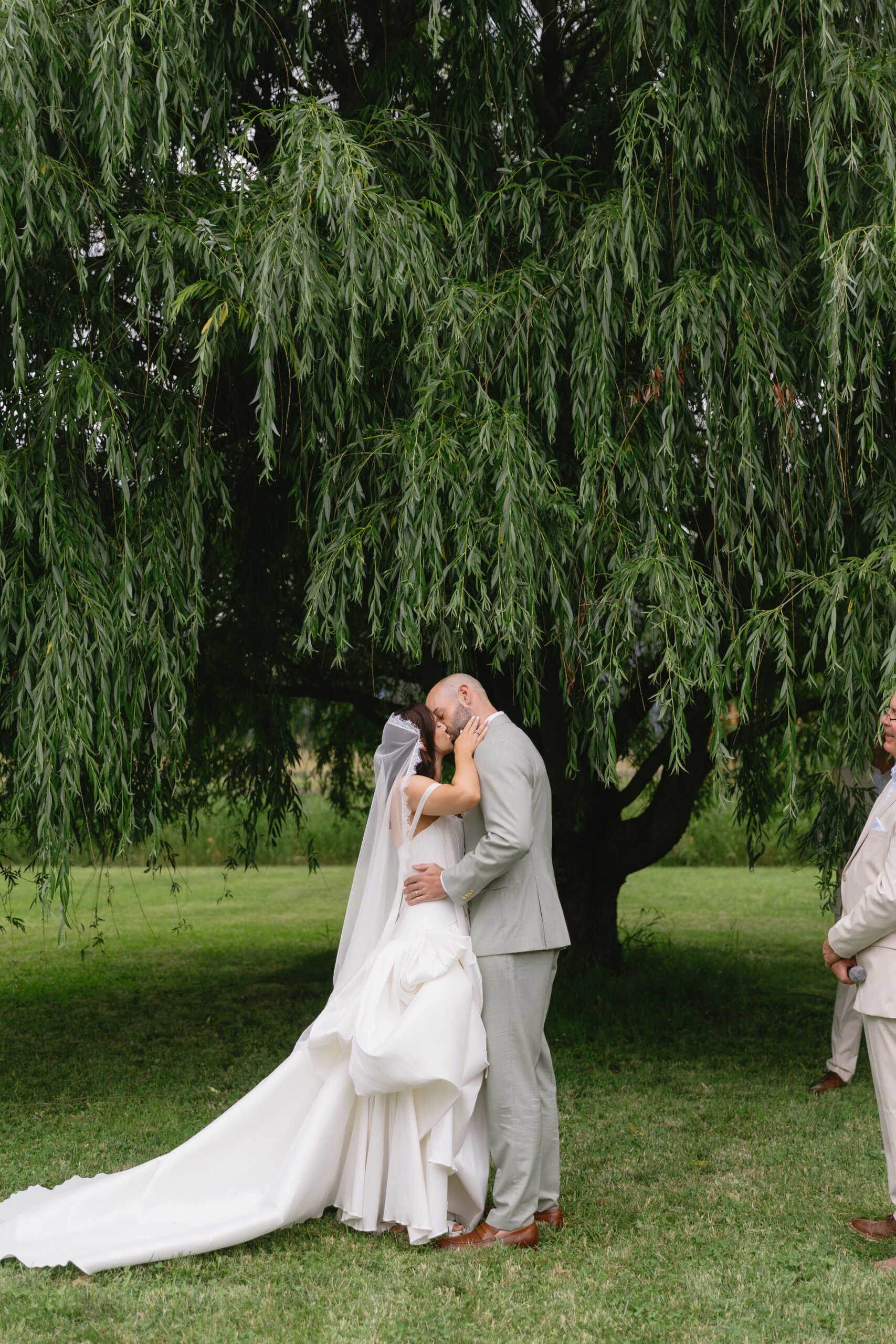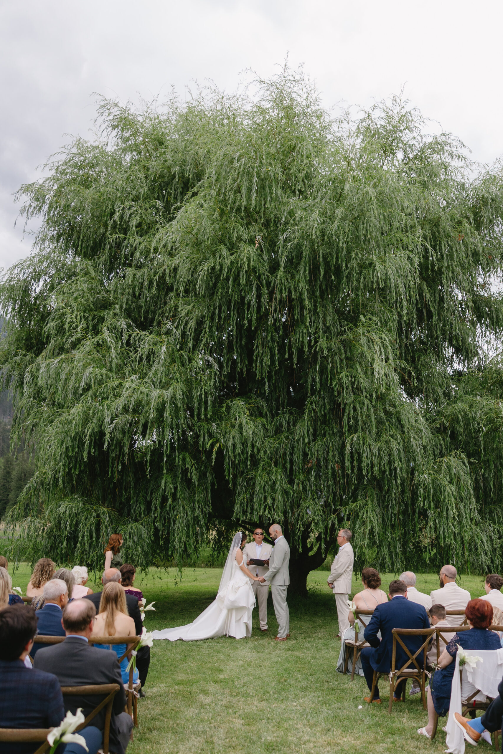 The ceremony was held on the lawn under a magnificent willow tree. A setting that was peaceful, intimate, and naturally stunning. The willow’s sweeping branches provided a soft, romantic backdrop. While the surrounding greenery and open space added a feeling of quiet serenity. Guests gathered on the grass, surrounded by the gentle rustle of leaves and the soft mountain breeze. Creating a natural, relaxed atmosphere that encouraged connection and presence. Michelle and Andrew’s vows felt heartfelt and genuine, and the moment was a perfect balance of emotion and ease. A true reflection of who they are together.