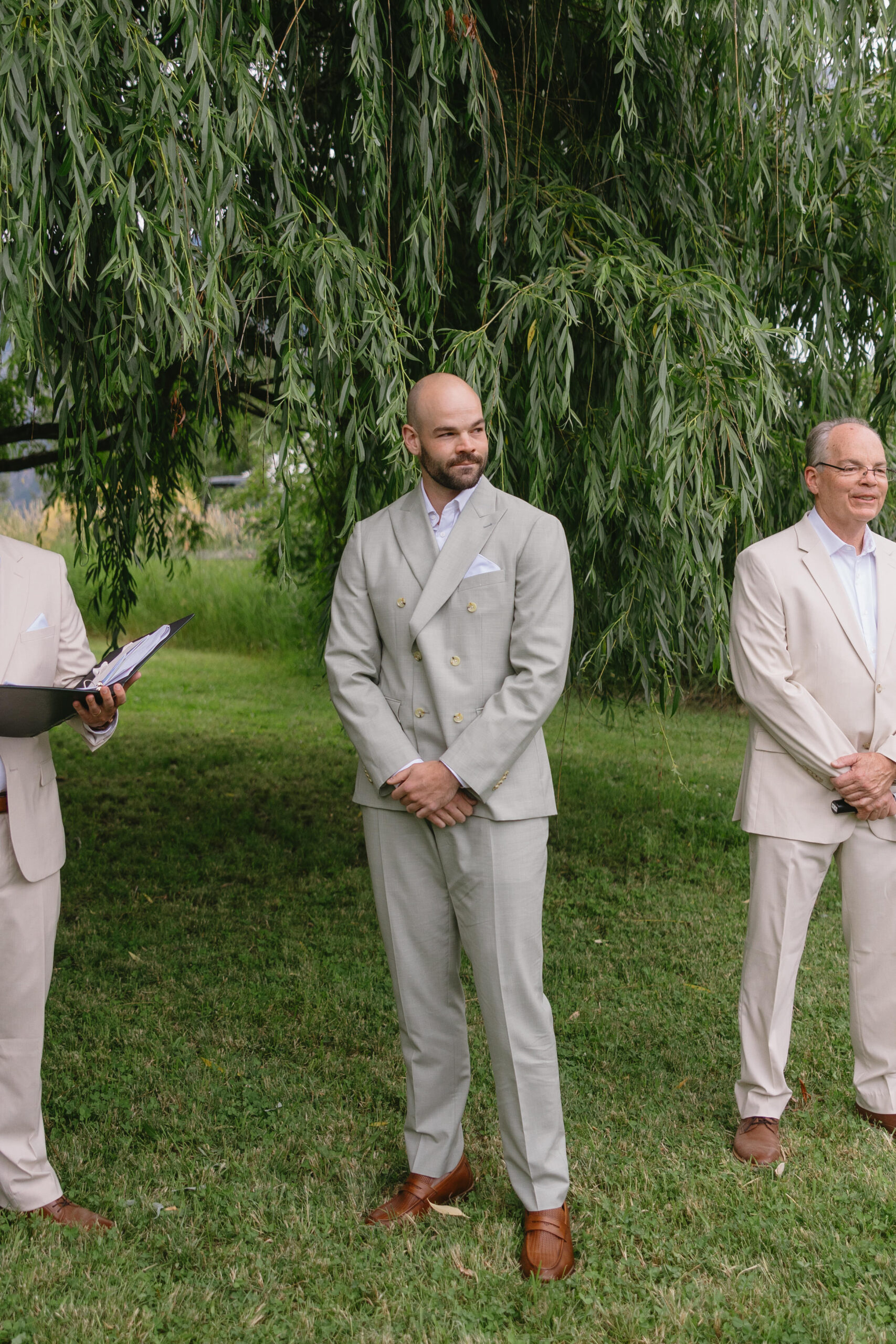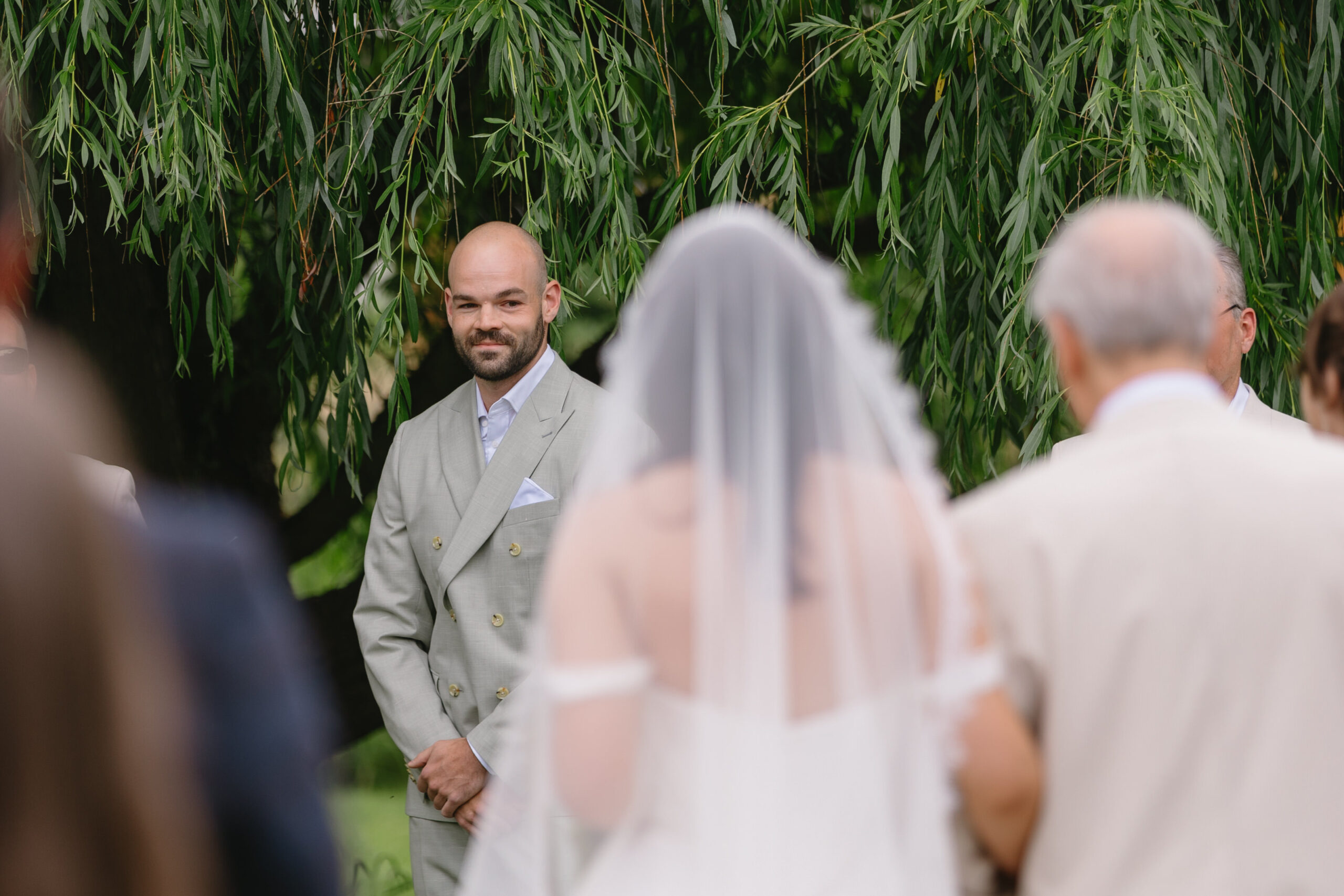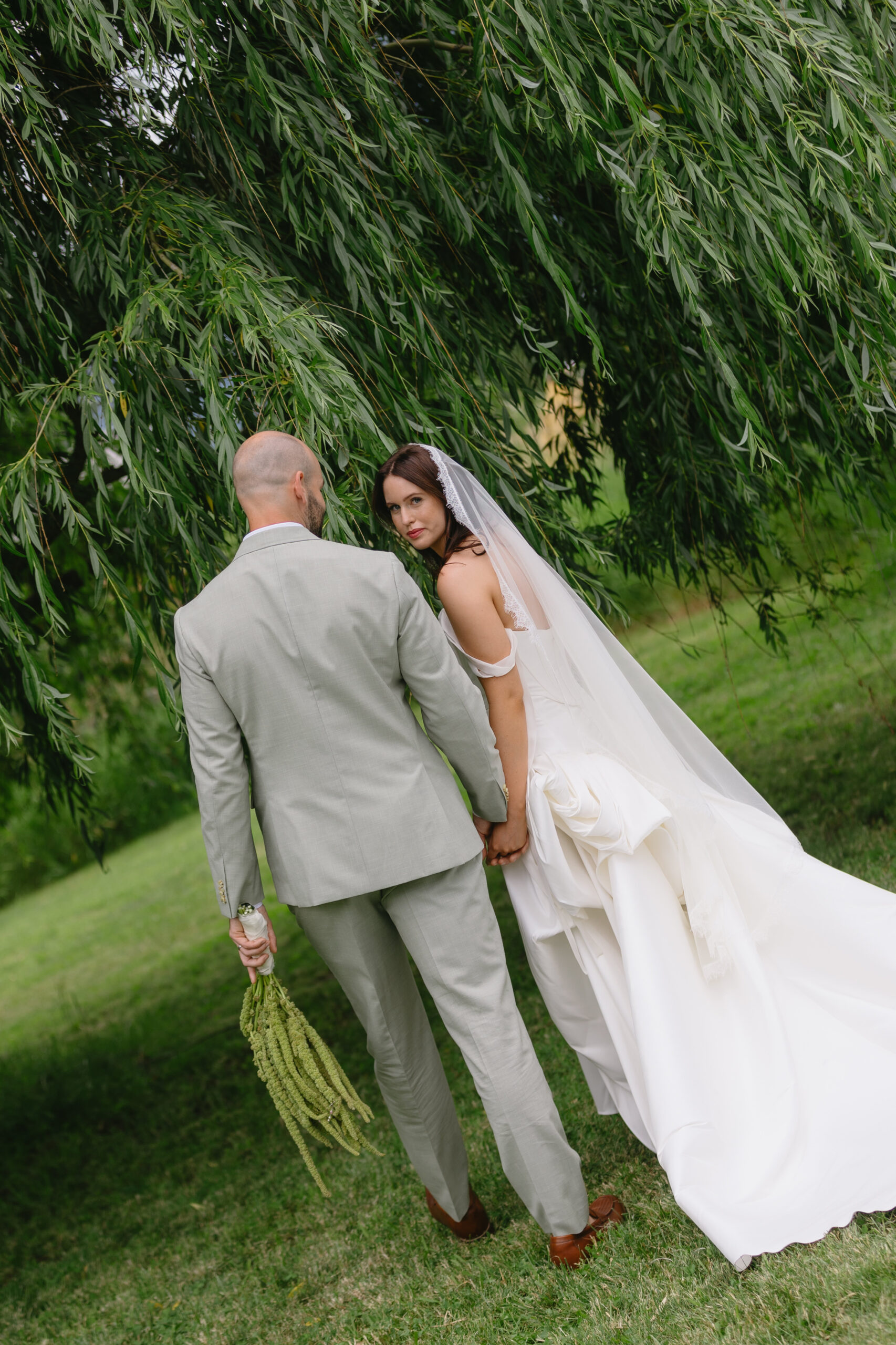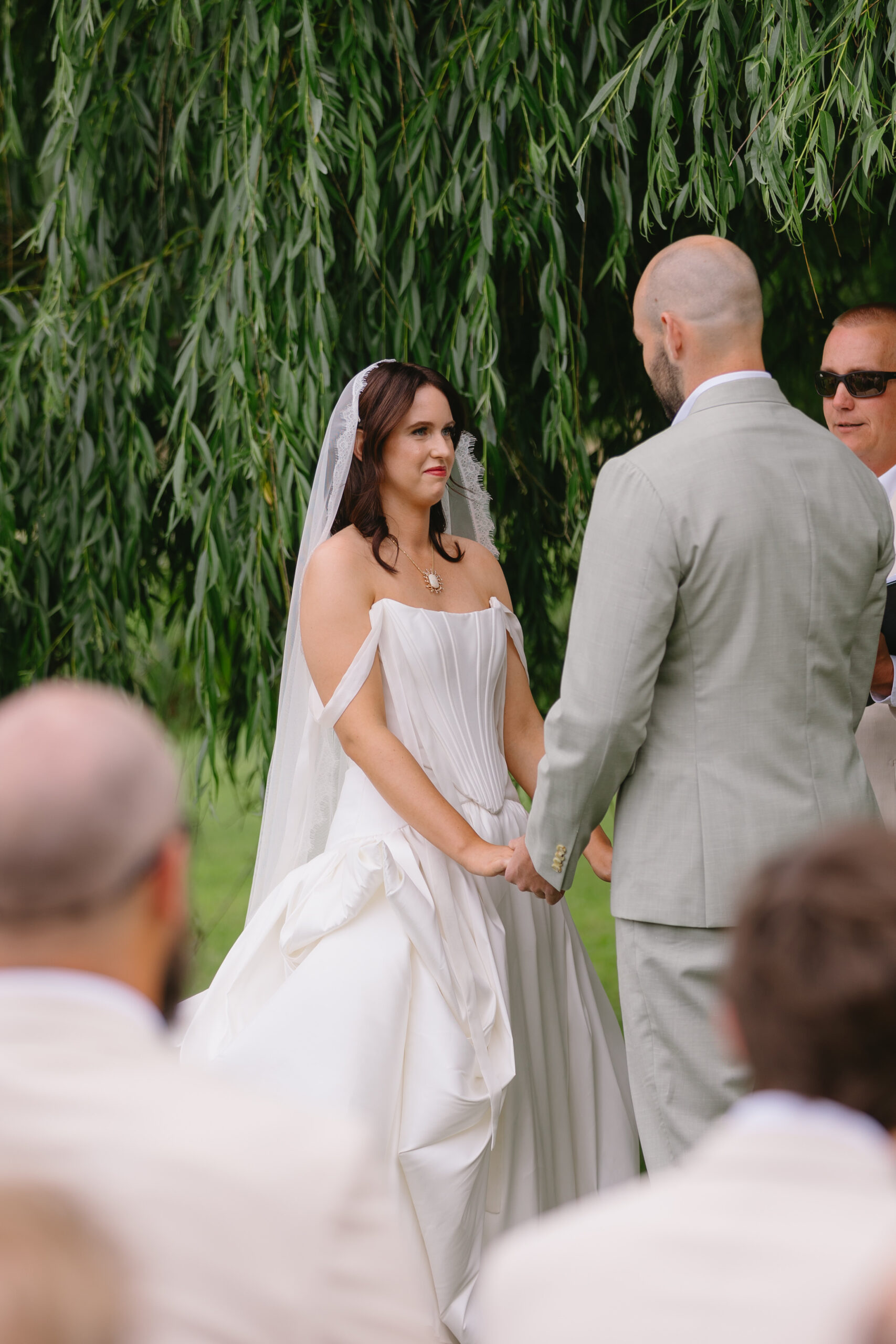 The ceremony was held on the lawn under a magnificent willow tree. A setting that was peaceful, intimate, and naturally stunning. The willow’s sweeping branches provided a soft, romantic backdrop. While the surrounding greenery and open space added a feeling of quiet serenity. Guests gathered on the grass, surrounded by the gentle rustle of leaves and the soft mountain breeze. Creating a natural, relaxed atmosphere that encouraged connection and presence. Michelle and Andrew’s vows felt heartfelt and genuine, and the moment was a perfect balance of emotion and ease. A true reflection of who they are together.
