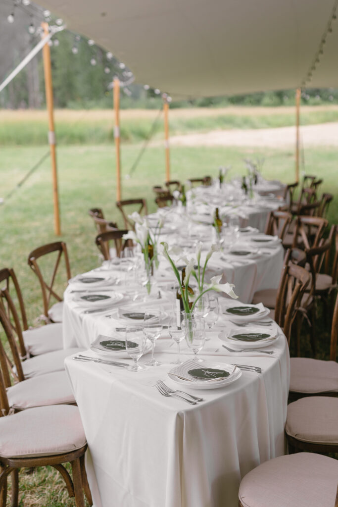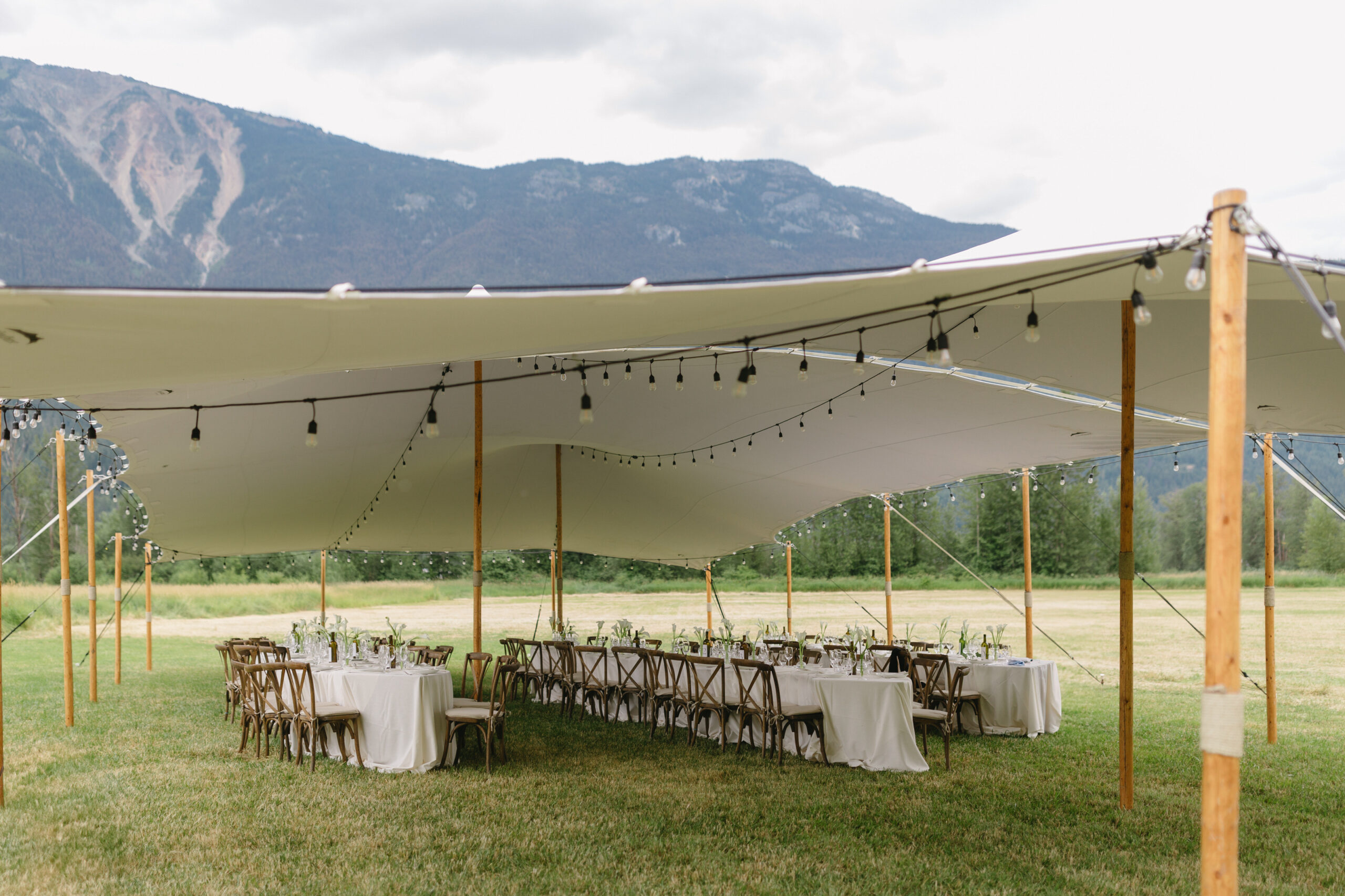 Michelle and Andrew also made a point to ensure that the day felt like them in smaller, intimate ways. The mix of modern, elegant design with natural, outdoor touches reflected their personalities perfectly. Guests were treated to a day that felt simultaneously grand and intimate, with moments that were meant to be savoured, including quiet laughs between the couple during the ceremony, a shared toast in the field with mountains as the backdrop, and later, the warm glow of candlelight under the tent during dinner. These little moments, paired with thoughtful design and intentional touches, made the day feel truly special.