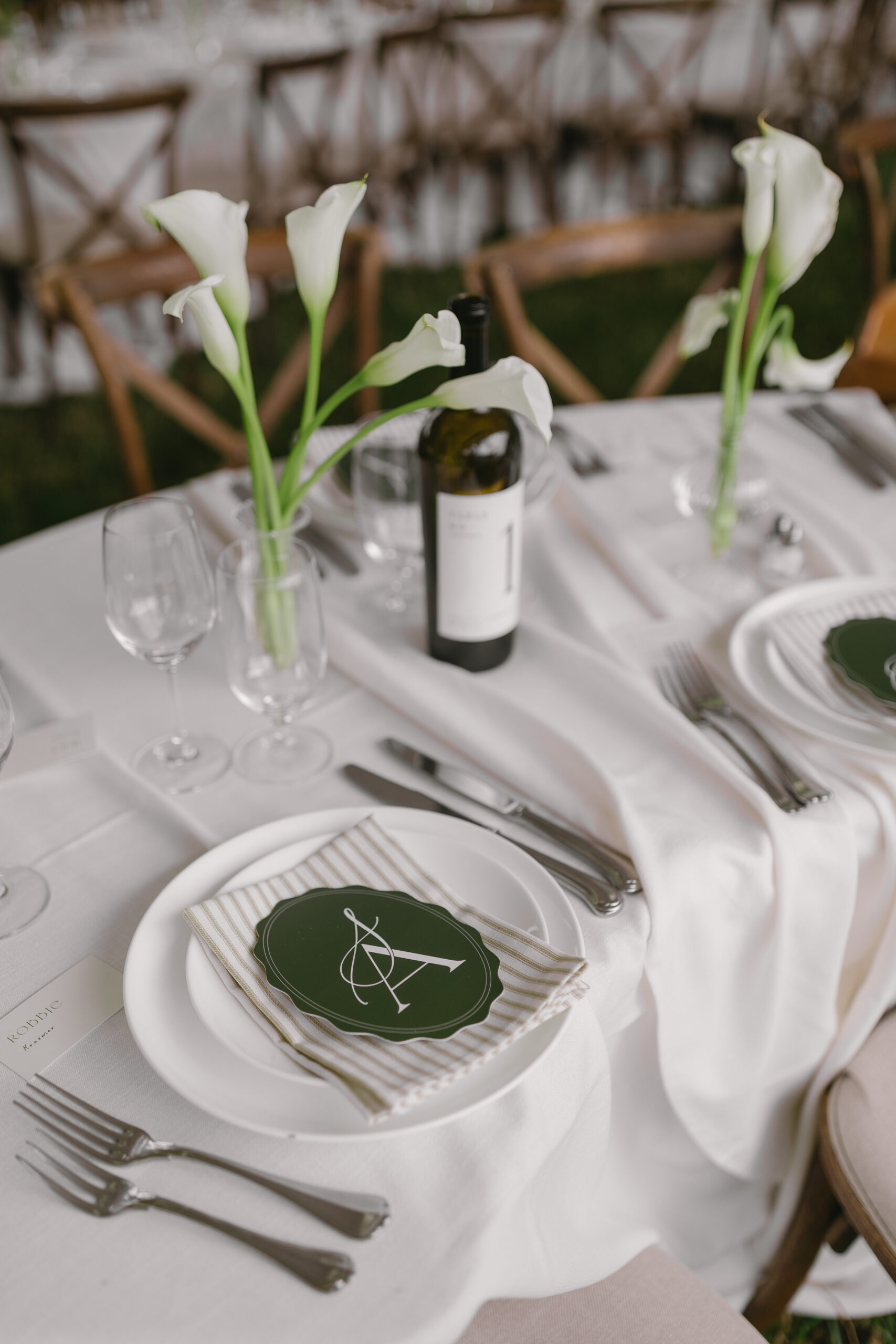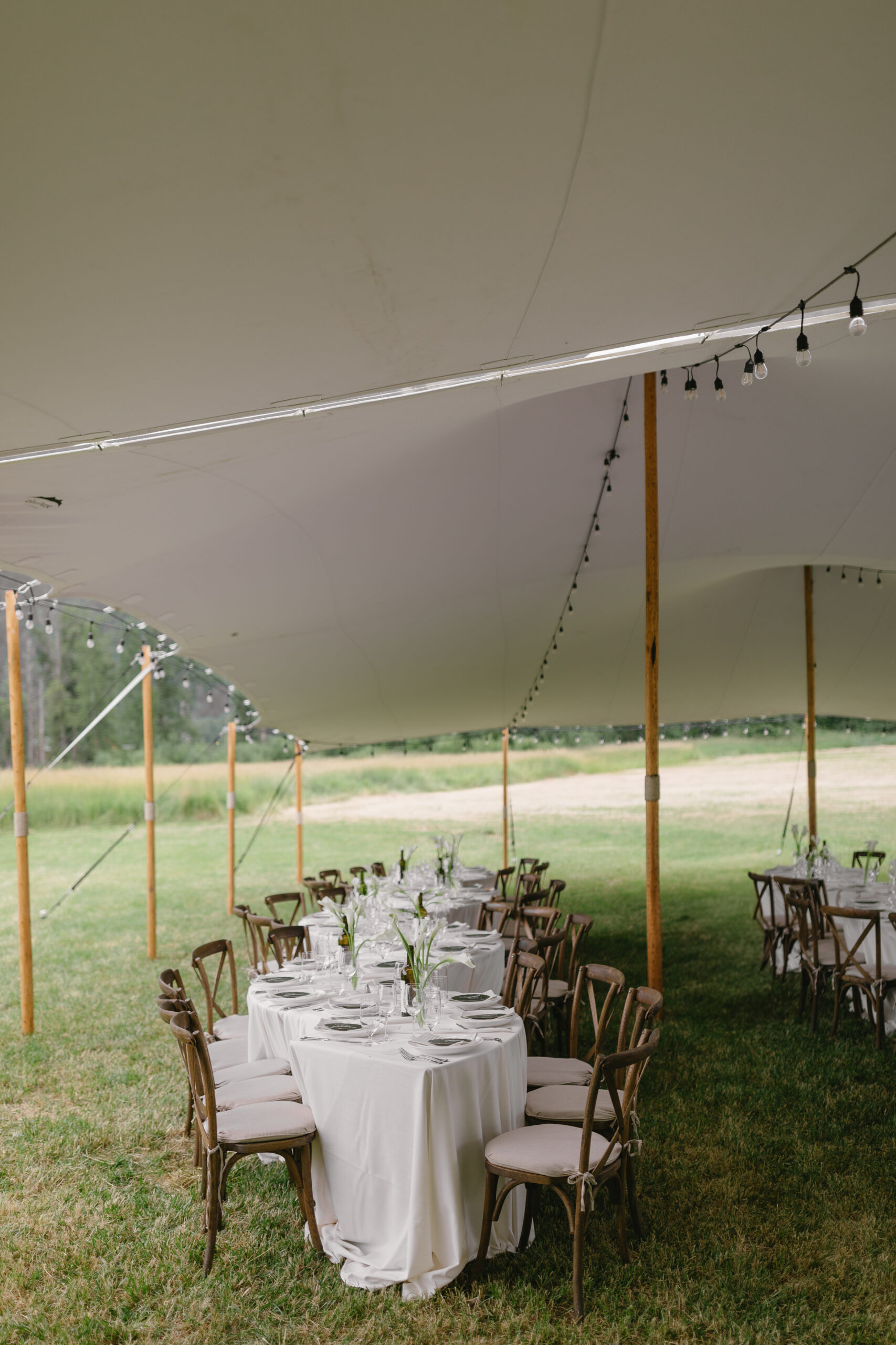 The reception took place in the same field, under a beautifully appointed tent that maintained the feeling of openness while adding structure and warmth. Tables were set up in gentle, winding curves, draped with soft, flowing linens. Paired with bentwood chairs from Pedersens Event Rentals, adding a timeless and refined touch to the field-tent reception. Candles and green accents added warmth and texture. Creating a cozy, inviting atmosphere that encouraged guests to relax and enjoy the evening. Thoughtful details, like table numbers displayed on bottles of wine, kept each table personal and intentional, perfectly aligned with Michelle and Andrew’s elevated style.